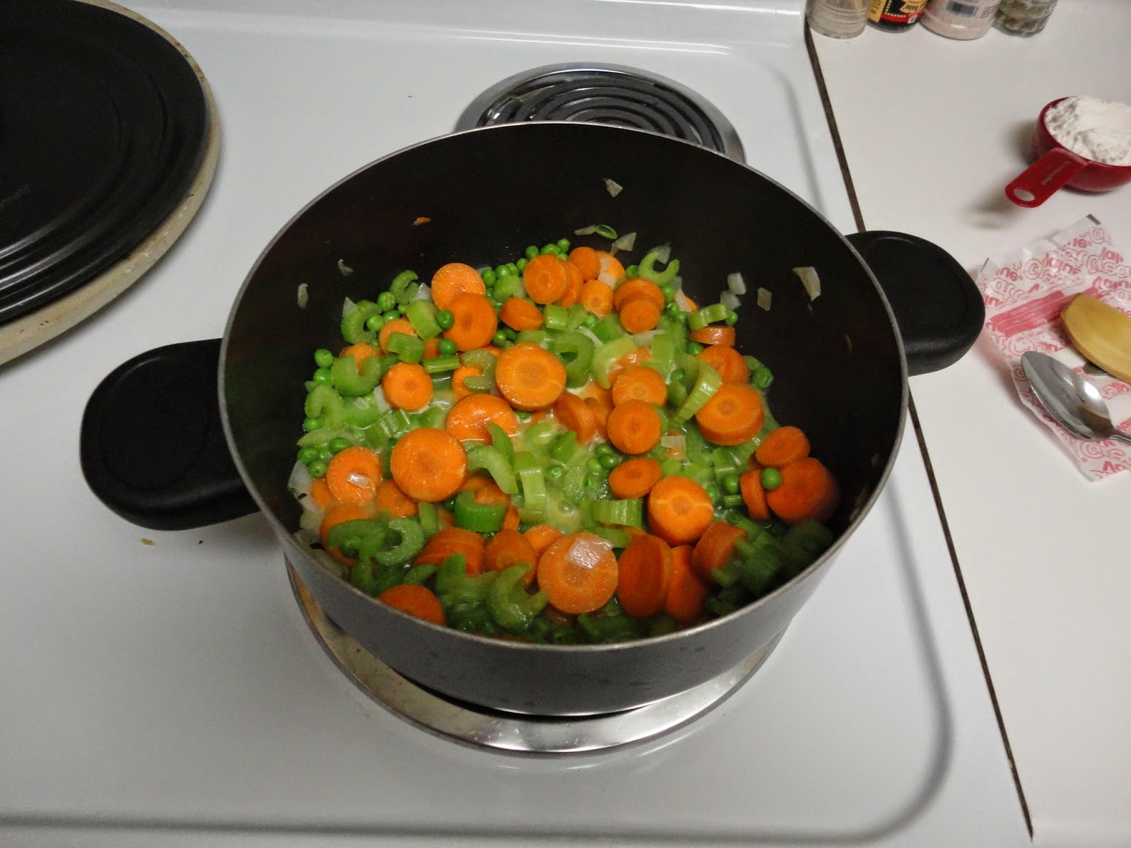 Heat oven to 425 degrees. Melt butter in a large saucepan and saute celery, carrots, onions and green peas until the veggies are soft and the onion is translucent. Add flour to coat vegetables. Add broth and milk a little at a time. Add salt, pepper, celery seed and thyme. Stir and simmer over low heat until thickened.